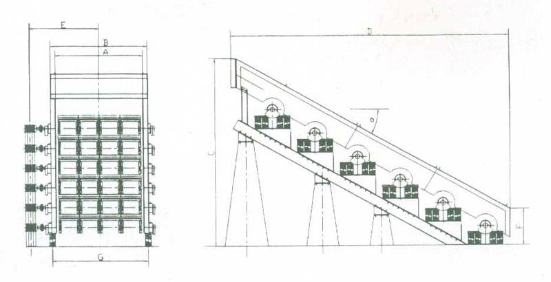該系列篩主要由篩架、篩箱、篩板、激振器、電動機、減振彈簧等部分組成。其特點是篩板為單根篩絲縱向排列布置,并且直接安裝于激振器上。激振器為單軸式,安裝于篩架上與篩箱分離,并由電動機通過輪胎式聯軸器帶動旋轉,產生離心慣性力,激振器帶動篩板振動,篩箱不參振。篩子振動時的軌跡為圓型。